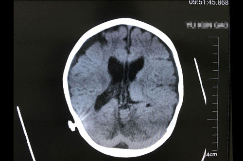 亮亮正式出院三个月后复查CT影像显示:慢性中度以上阻塞性脑积水,脑室分流术后改变