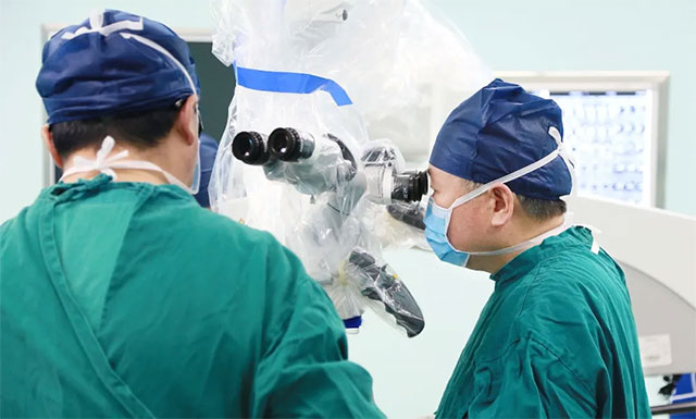 7月6日上午8:00,手术开始。李士其教授在吴治群博士及医护团队协助下全神贯注,在蔡司显微镜 (双荧光) 下进行手术,发现一大小约2.5X3X2 cm 肿物,质地中等,血供丰富,与周围组织界限清。李士其教授处变不惊,小心翼翼地将肿瘤与小脑幕分离,在显微镜下完整切除,暴露并保护面听神经及相邻血管,残腔止血彻底……整台手术历时5个多小时,终于将患者脑部肿瘤顺利切除。根据病理检测,患者确诊为小脑脑桥角脑膜瘤。