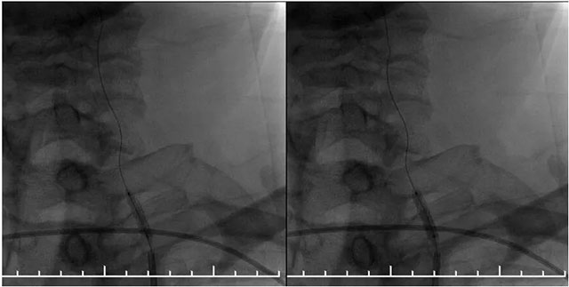 ▲ 药物洗脱球囊在微导丝导引下到位于左侧椎动脉支架内,充分扩张药物球囊使其贴壁