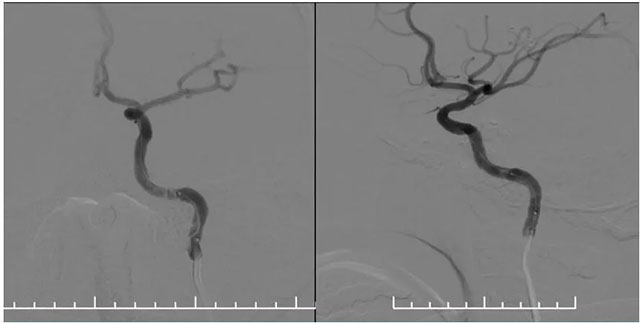 术中,张琪博士在刘春医生、周林华医生及医护团队协助下从左侧股动脉穿刺,置入6F导管鞘。将6F导引导管在泥鳅导丝导引下置入左侧颈内动脉,造影明确岩骨段狭窄呈,测量狭窄段长度及近远端血管支架,选择合适支架,随后在微导丝辅助下越过狭窄段超选至C6段,选用4.0*18球扩支架,沿微导丝到位狭窄段,球囊扩张至6atm,即刻释放支架,即刻造影见狭窄明显改善,支架贴壁良好,血流通畅,狭窄段完全覆盖。