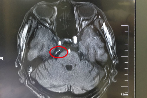术前核磁共振显示:双侧三叉神经周围见小血管与之接触,并见骑跨