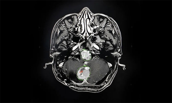 入院后,肿瘤科(放疗)头部伽玛刀组主任陈琦为他完善了MRI检查,明确多处肿瘤的位置、体积(单体肿瘤最大直径约2.7cm)。经与神经外科、医学影像科等开展MDT多学科联合会诊,评估复发肿瘤病灶毗邻脑干等重要功能区,手术难度高、风险大,可通过头部伽玛刀治疗,控制肿瘤生长,快速缓解临床症状。
