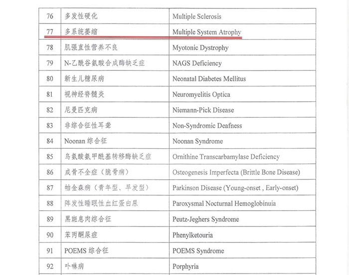 多系统萎缩(multiple system atrophy,MSA)是一种散发的、病因不明的神经系统变性疾病。该病多为中老年起病,以进展性自主神经功能障碍,伴帕金森症状、小脑性共济失调症状及锥体束征为主要临床特征。2018年,在由国家卫健委等五部委联合发布的《第一批罕见病》目录中,多系统萎缩“榜上有名”。