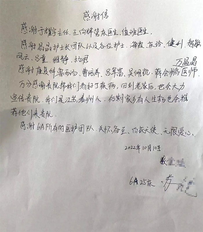 苏先生和家属都对取得的治疗效果比较满意,对病区的优质服务更是高度认可,临出院时更专门为此写下感谢信。“回到老家后,也会大力宣传贵院。……也会推荐他们来贵院。”寥寥数语,勾勒出患者的朴实纯真,以及发自心底、喷薄而出的的感激之情。短暂的一段求医之旅,记下了17个可爱的名字,更在脑海中刻下了17张贴心的笑脸。