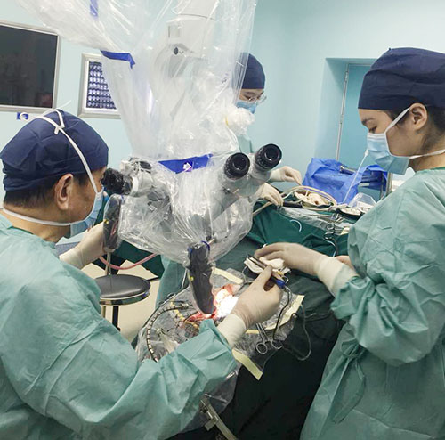 ▲沈建康教授在显微镜下为患者切除了肿瘤