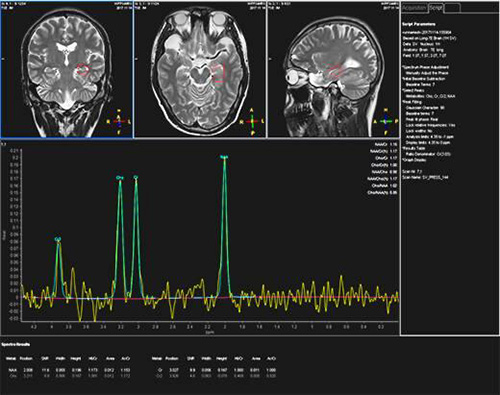 为进一步明确癫痫病灶区,又对其进行了MR海马MRI平扫+MRS+MRSI:1、双侧海马MRI平扫未见明显异常信号;2、MRS 双侧海马Cho峰稍微升高(右侧NAA/Cr+Cho=0.65;左侧NAA/Cr+Cho=0.63)结合临床。3、左侧颞叶及左侧额叶软化灶形成,结合临床病史。