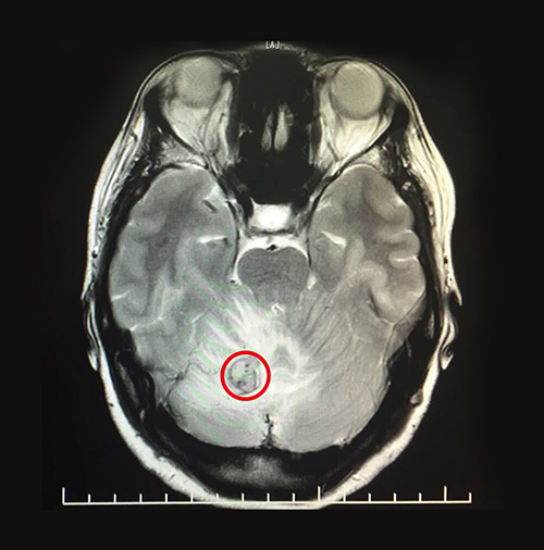 ▲MRI影像显示,患者小脑有一个大小约15mmx15mm的肿瘤