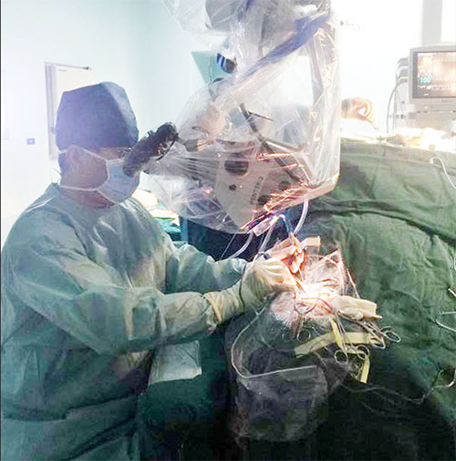 手术开始,在显微镜的助力下,医术精湛的主任很快便精准的确定了患者的病灶区,整个手术操作过程他都一丝不苟。术中,可见其红色肿物,表面较光滑,血供丰富,充分切断肿物周围血供,最终完整切除了整个肿物,大小约15mmx15mmx15mm,历经3个小时,手术顺利完成。