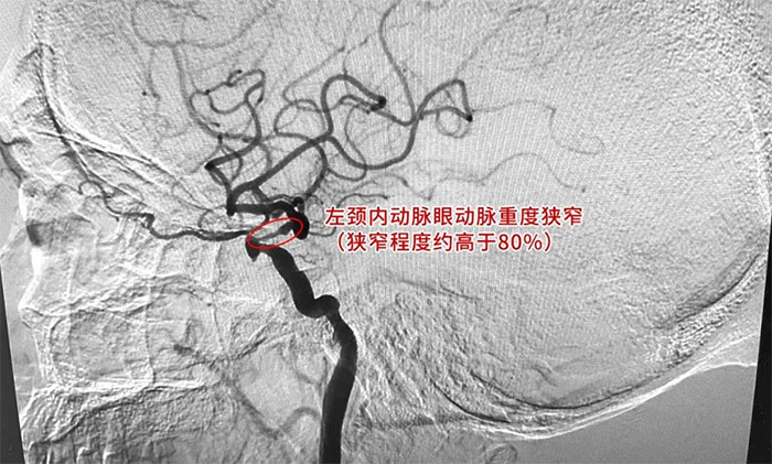 为进一步明确诊断并制定治疗方案,周君主任与医院学术副院长兼神经内科4A病区主任席刚明教授对患者病情开展了讨论评估,由席教授为患者进行DSA全脑血管造影检查,造影可见左颈内动脉岩骨水平段中度狭窄,左颈内动脉海绵窦段轻度狭窄,左颈内动脉眼动脉重度狭窄(狭窄程度约高于80%)。
