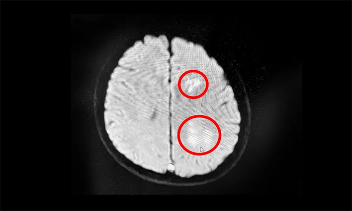 ▲MR提示:左侧额顶叶多发(静脉性)脑梗塞