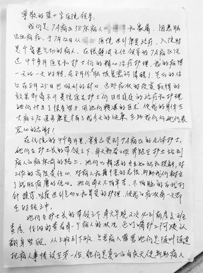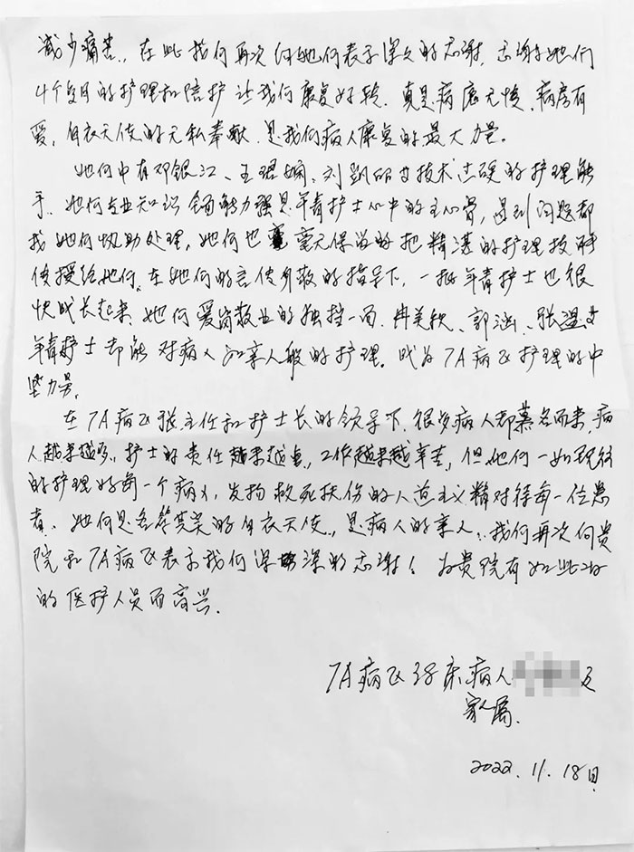 “她们是名副其实的白衣天使,是病人的亲人,我们再次向贵院和7A病区表示我们深深的感谢!为贵院有如此好的医护人员而高兴。”近日,上海蓝十字脑科医院神经内科7A病区38床患者家属,已年近八旬的朱奶奶,再次执笔写就一封感谢信,文中通过情真意切的文字,向7A病区张静波主任医护团队表达了真挚感谢。
