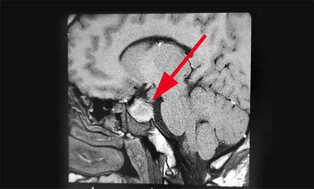 入院时,患者已经连续9天阵发性头痛,经检查其左侧眼睑有轻微下垂,约1米距离时有视物重影等症状,双眼视力0.2,四肢指关节较之前变粗大。针对患者情况,6B病区主任潘仁龙基于多年临床经验立即作出判断,急行头颅鞍区MRI平扫+增强,显示:蝶鞍显著扩大,鞍底下陷,鞍区见一不规则肿块,大小约1.6*3.2*2.1cm,病变向周围生长,突入鞍上池,推移视交叉,向下生长,鞍底受压,向鞍旁生长,海绵窦推挤改变。